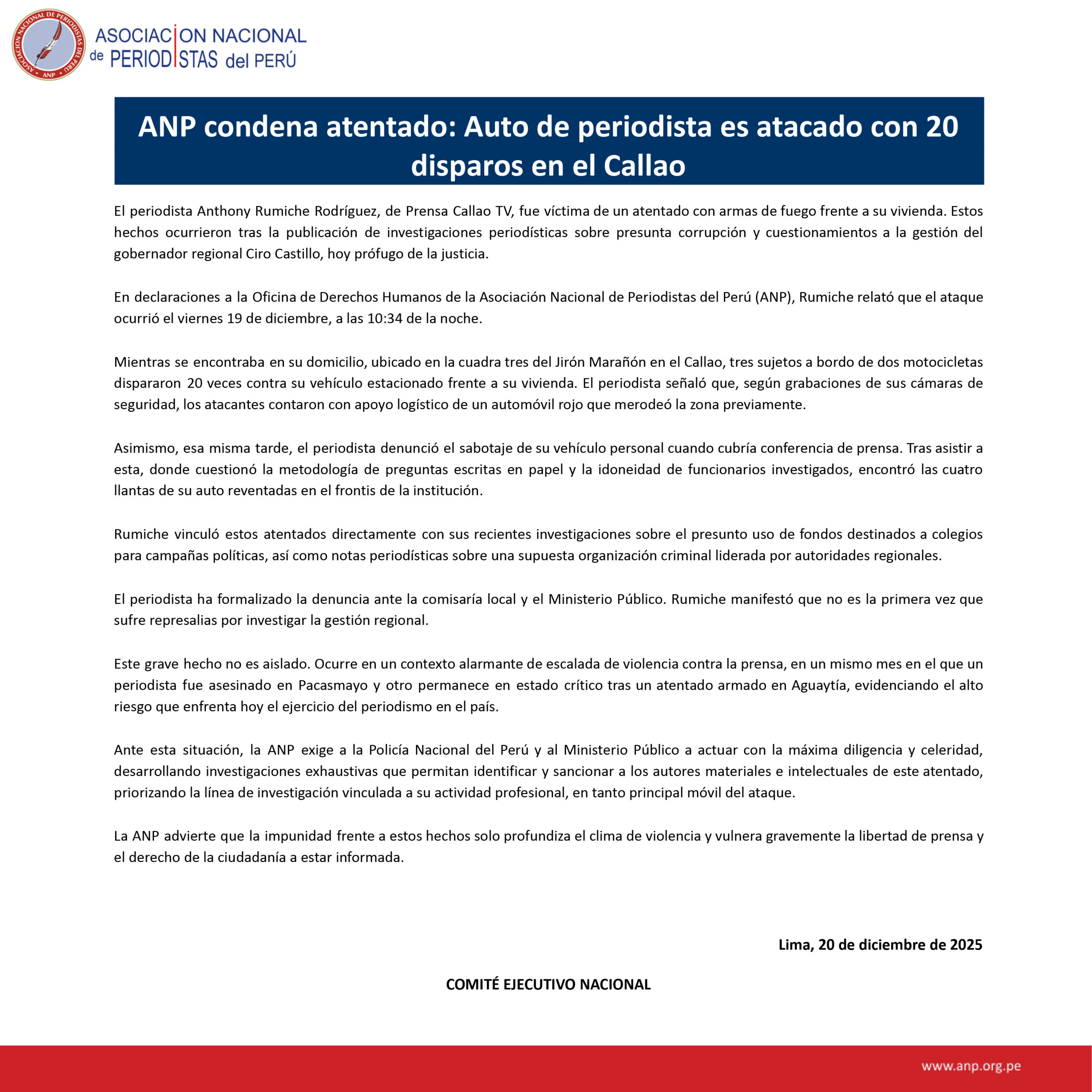 El periodista Anthony Rumiche Rodríguez, de Prensa Callao TV, fue víctima de un atentado con armas de fuego frente a su vivienda. Estos hechos ocurrieron tras la publicación de investigaciones periodísticas sobre presunta corrupción y cuestionamientos a la gestión del gobernador regional Ciro Castillo, hoy prófugo de la justicia.