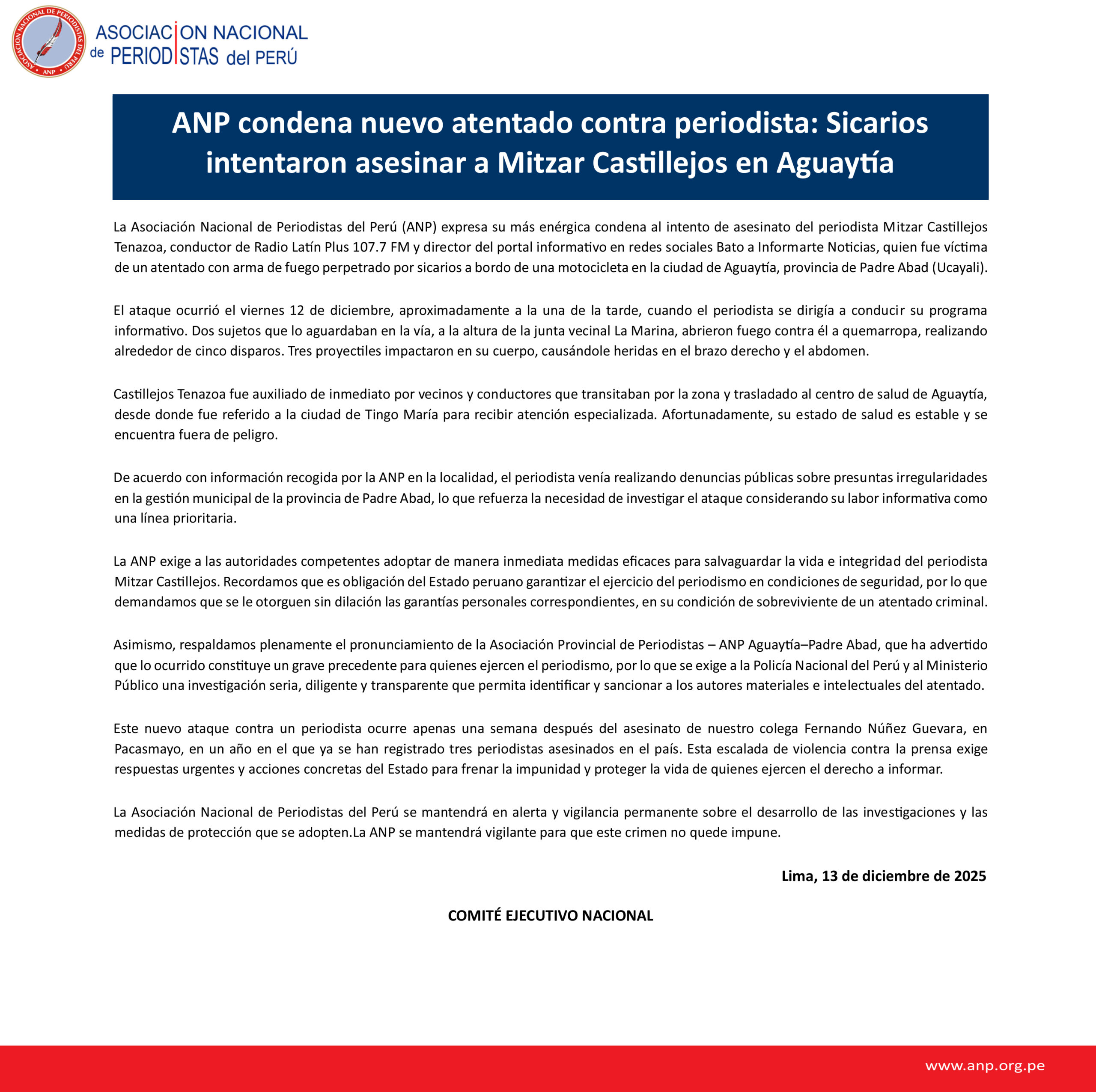 La Asociación Nacional de Periodistas del Perú (ANP) expresa su más enérgica condena al intento de asesinato del periodista Mitzar Castillejos Tenazoa, conductor de Radio Latín Plus 107.7 FM y director del portal informativo en redes sociales Bato a Informarte Noticias, quien fue víctima de un atentado con arma de fuego perpetrado por sicarios a bordo de una motocicleta en la ciudad de Aguaytía, provincia de Padre Abad (Ucayali).