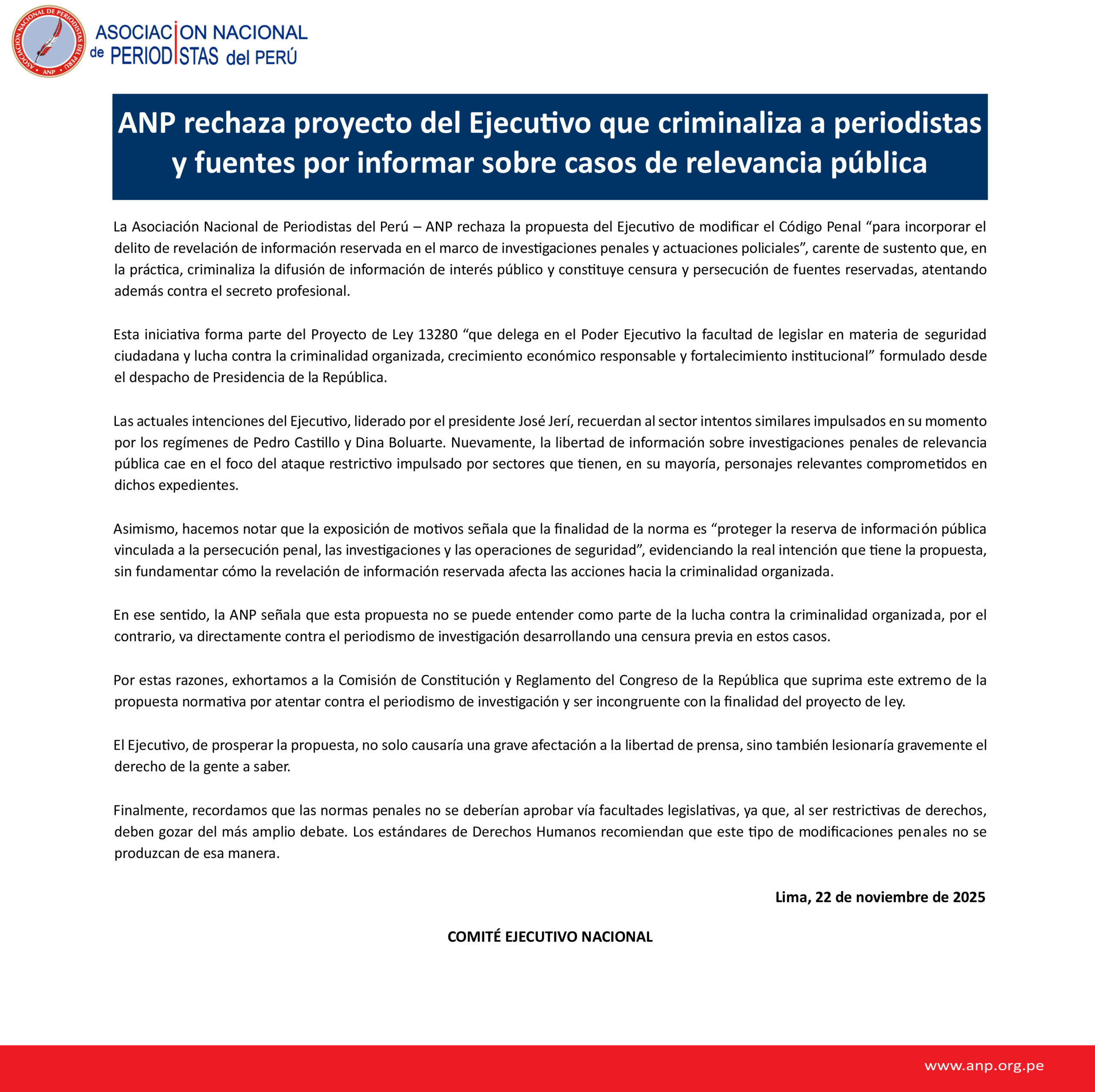 La Asociación Nacional de Periodistas del Perú – ANP rechaza la propuesta del Ejecutivo de modificar el Código Penal “para incorporar el delito de revelación de información reservada en el marco de investigaciones penales y actuaciones policiales”, carente de sustento que, en la práctica, criminaliza la difusión de información de interés público y constituye censura y persecución de fuentes reservadas, atentando además contra el secreto profesional.