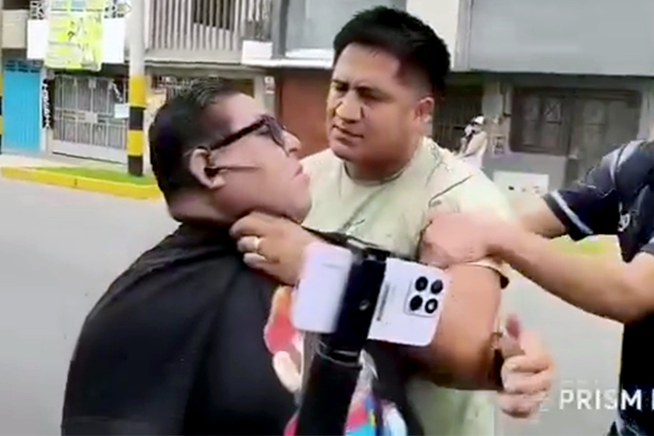 En estas circunstancias, un hombre que se identificó como hermano del fallecido se acercó de manera amenazante exigiendo que cortara la transmisión. El periodista intentó calmar al sujeto, según relata, pero éste reaccionó violentamente sujetándolo del cuello e intentando ahorcarlo.