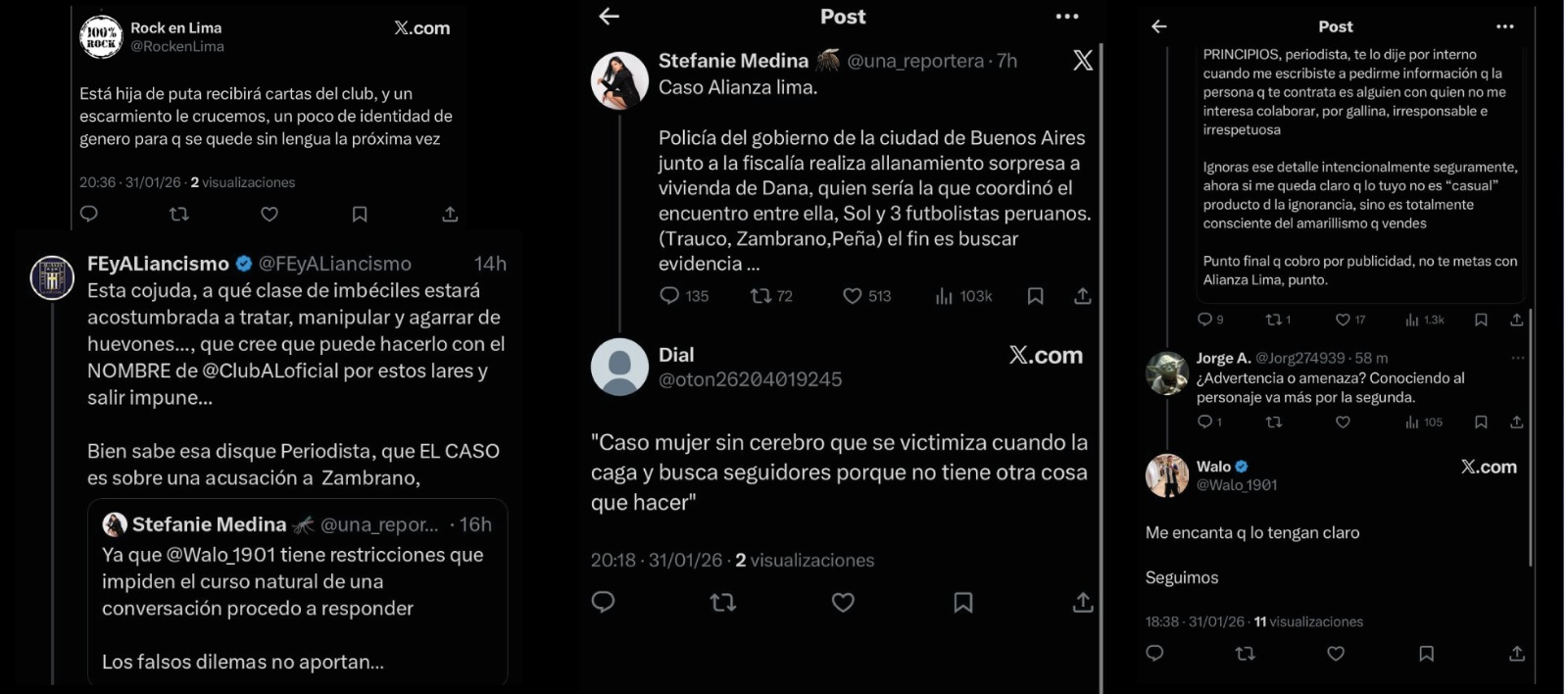 La periodista Stefanie Medina, del programa ContraCorriente de Willax Televisión, es blanco de una violenta campaña de hostigamiento, insultos y amenazas de muerte a través de redes sociales. El acoso inició tras la publicación de información sobre una investigación relacionada con presuntos delitos de abuso sexual que involucrarían a futbolistas profesionales.