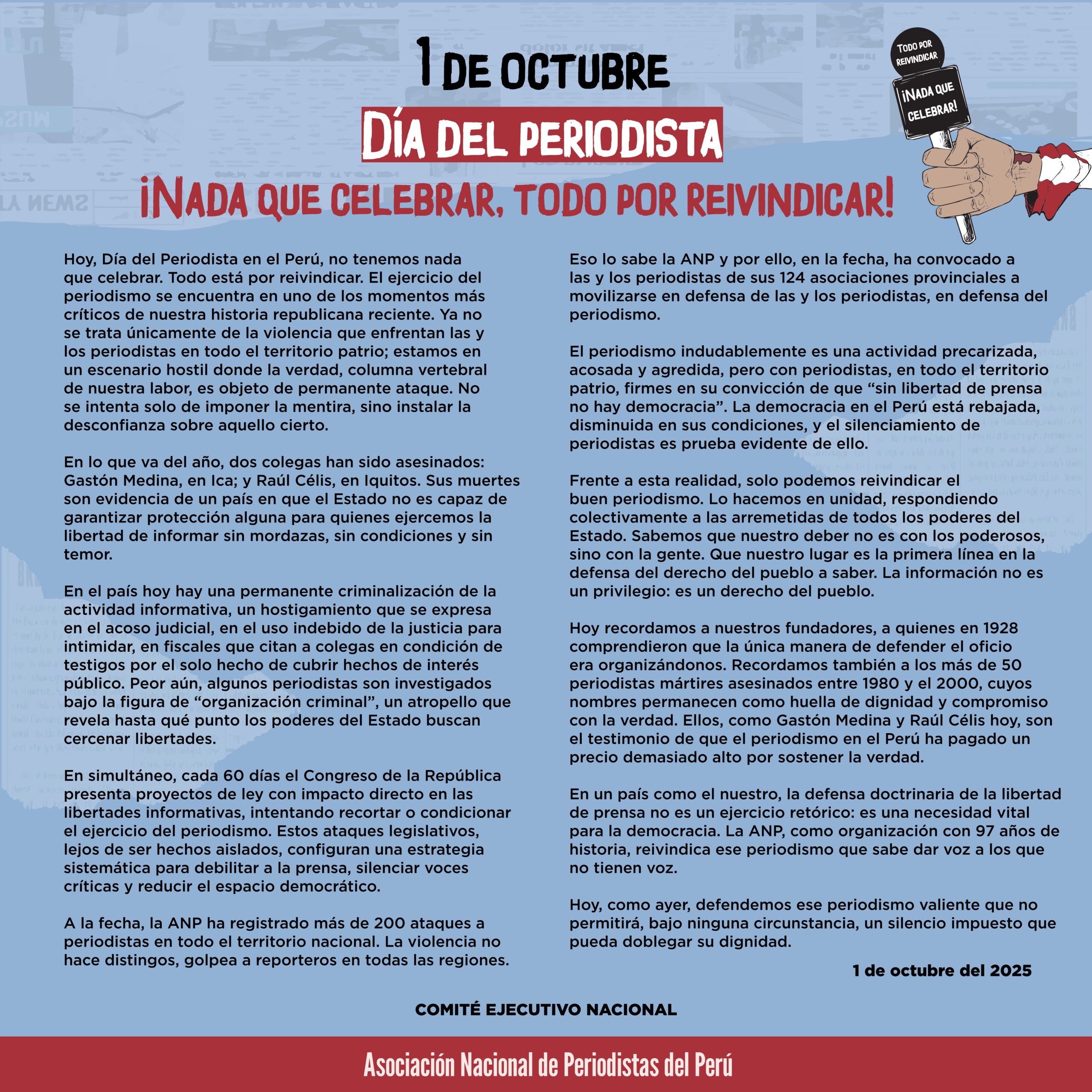 A la fecha, la ANP ha registrado más de 200 ataques a periodistas en todo el territorio nacional. La violencia no hace distingos, golpea a reporteros en todas las regiones. Eso lo sabe la ANP y por ello, en la fecha, ha convocado a las y los periodistas de sus 124 asociaciones provinciales a movilizarse en defensa de las y los periodistas, en defensa del periodismo.